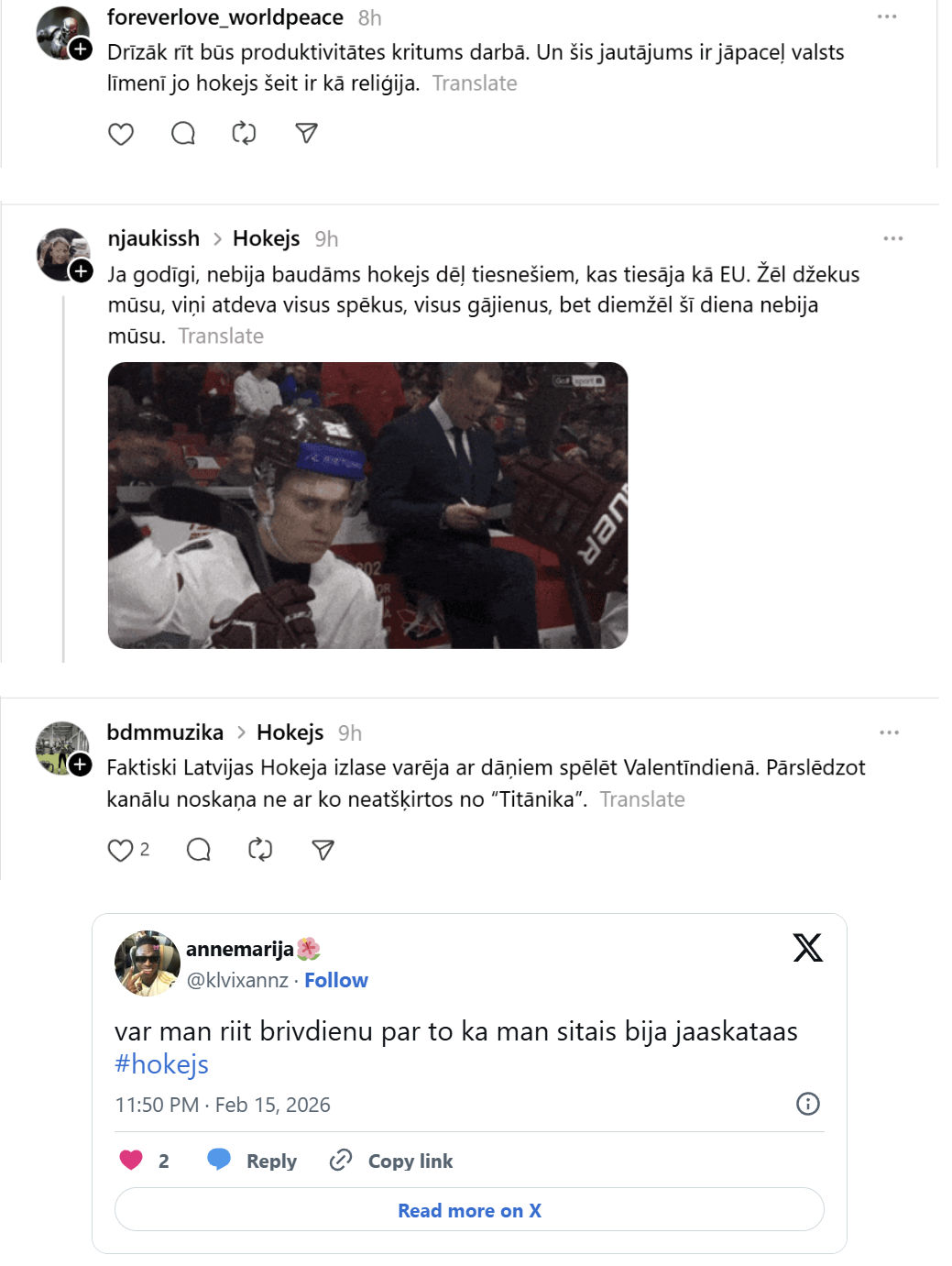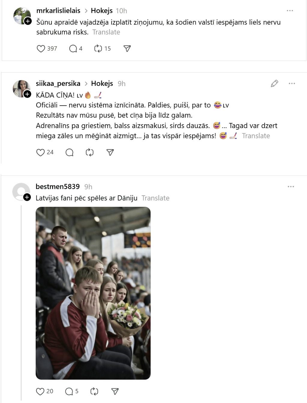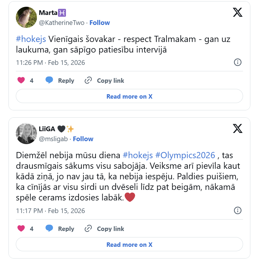 Taču lielākā daļa hokeja fanu nebūt nav apmierināti ar rezultātu. Daudzi līdzjutēji neslēpa vilšanos par Latvijas hokeja izlase sniegumu izšķirošajā mačā.