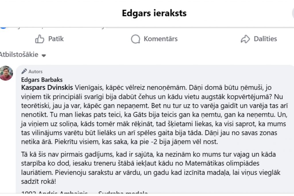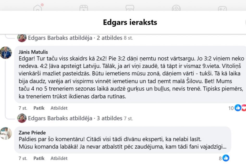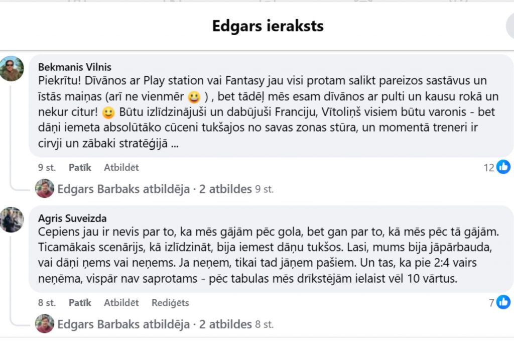 Bildē: Vātsargs, kurš es ceru arī tiks pie spēles šajā turnīrā.” Tā savu sakāmo beidz Edgars Barbaks. Zem šī ieraksta ir daudz un gari nozares entuziastu komentāri, kā tad mūsējiem pēdējā spēlē patiesi veicās.