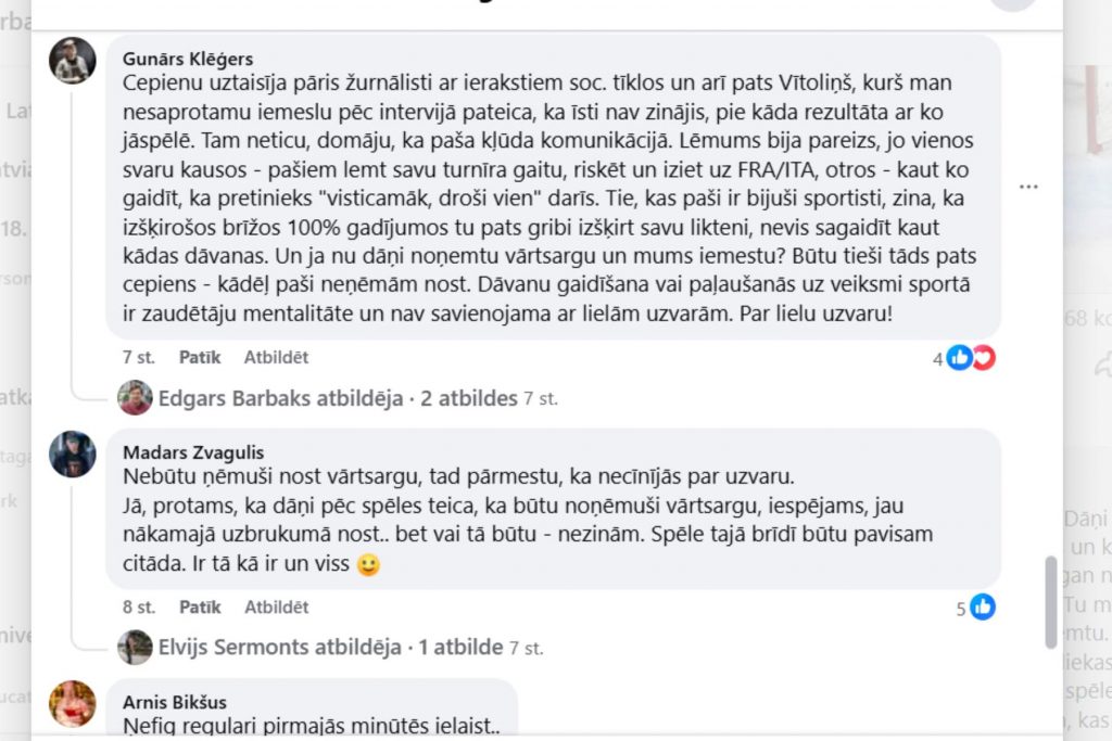 Viņš vientes Facebook kontā raksta šādi: “Cita lieta, ka Vītoliņš un pārējie treneri pieņēma lēmumu, kas nenostrādāja, un, protams, par to viņi var saņemt savu daļu kritikas. Vai lēmums bija nepareizs? Es nevaru atrast nevienu argumentu, lai tā teiktu. Mēs viņiem pamatoti varētu pārmest vēl vairāk, ja viņi necenstos paņemt maksimumu tai situācijā. Es vispār būtu spēlējis bez vārtsarga līdz beigām, bet to es tā pie TV ekrāna biju izdomājis.
