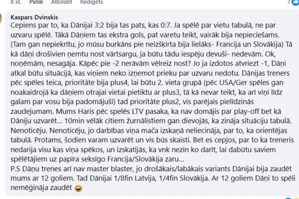 Mums vajadzēja vienus vārtus, lai spēlētu pret Franciju vai Itāliju. Dānija varēja samainīt tikai Zviedriju pret Čehiju. Domāju, ja dāņi nav galīgi dunduki, viņi saprata, ka pēc loģikas daudz lielāka iespēja ir, ka mēs mainīsim. Nu man tiešām neliekas starpība Čehija vai Zviedrija (bet ir starpība, ja viņu vietā var dabūt FRA vai ITA),” tā vispārējo tērgu pēc mūsu hokejistu dažādi vērtētās spēles pret Dāniju komentē sporta pasaules pārzinātājs Edgars Barbaks.