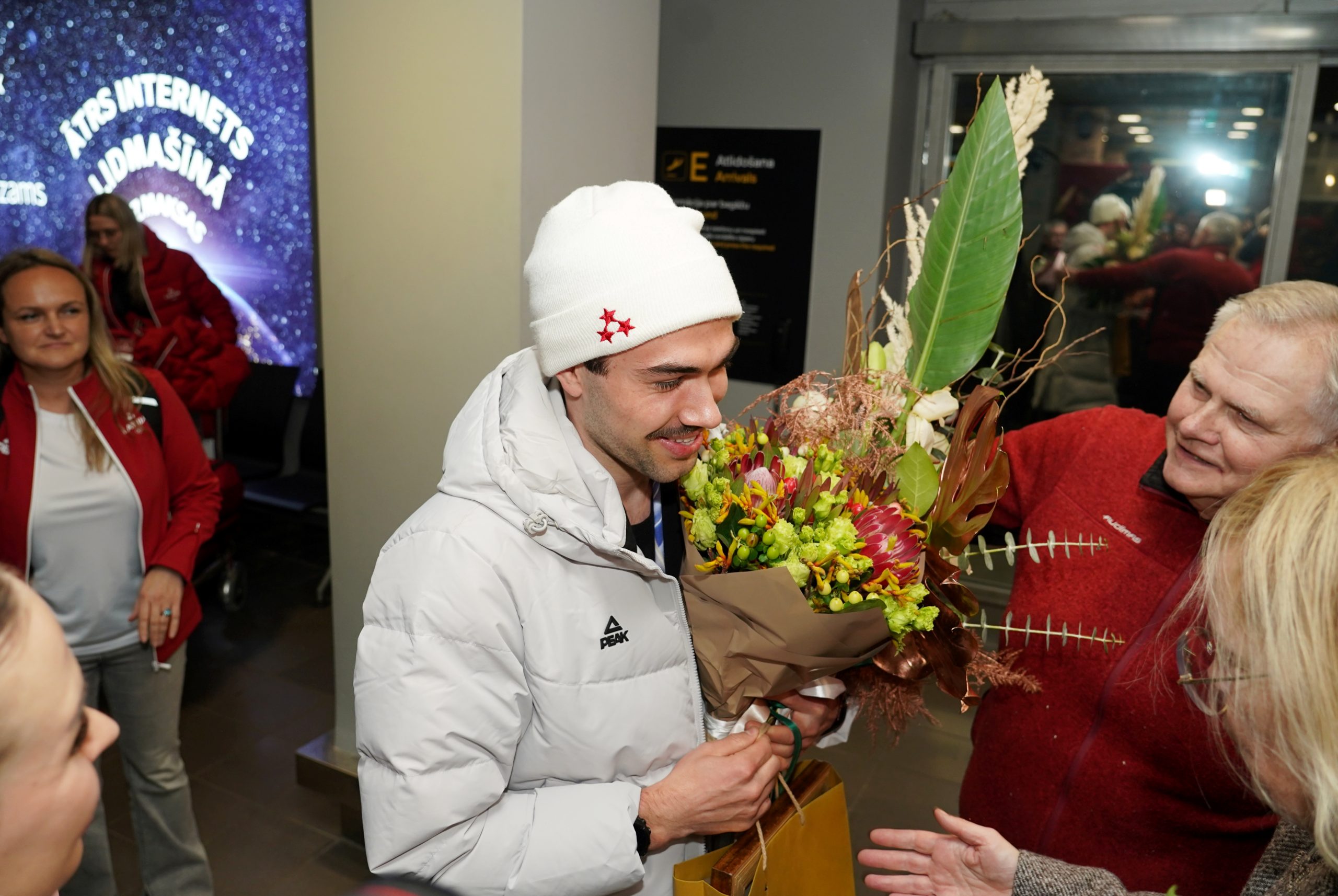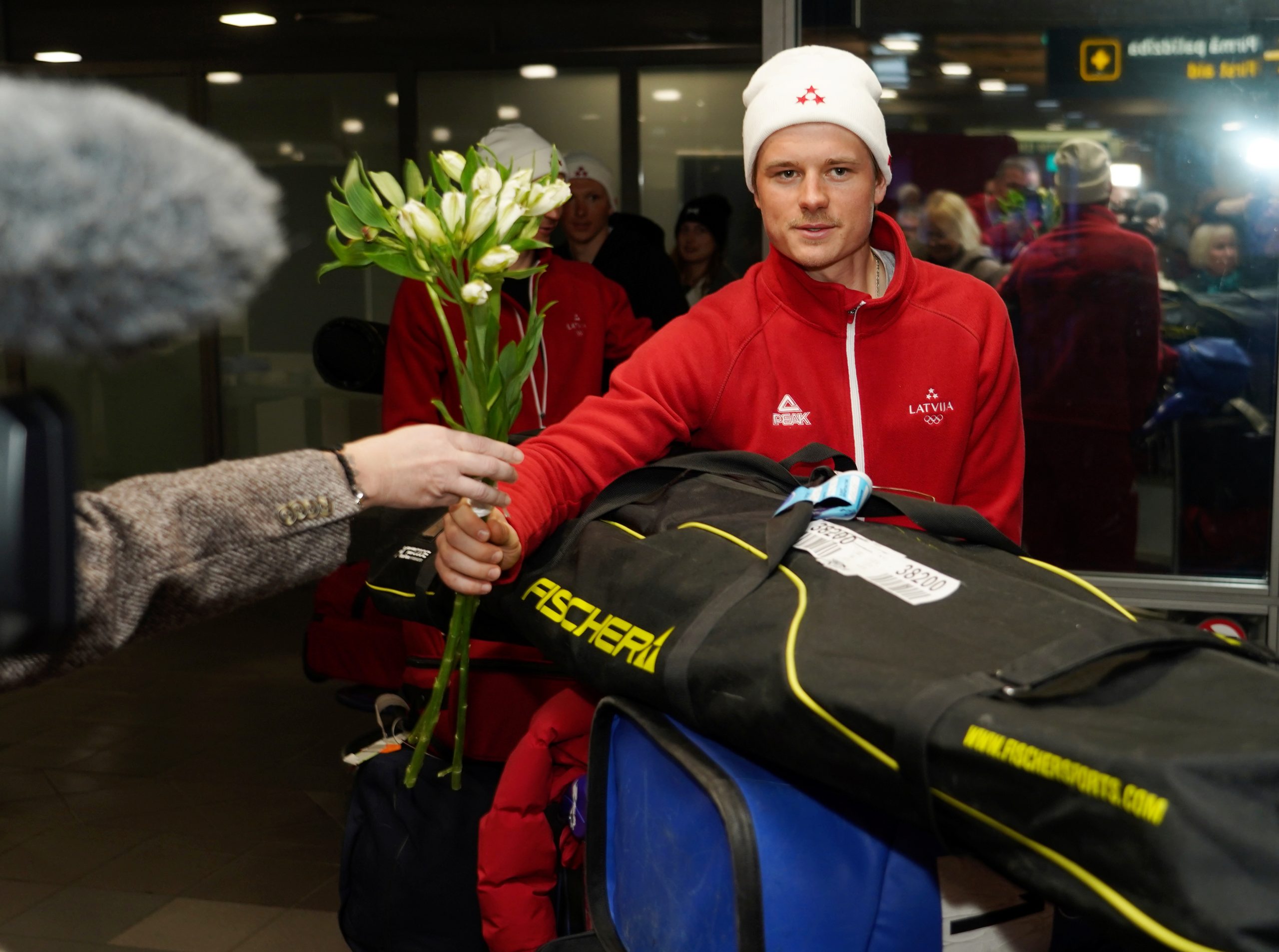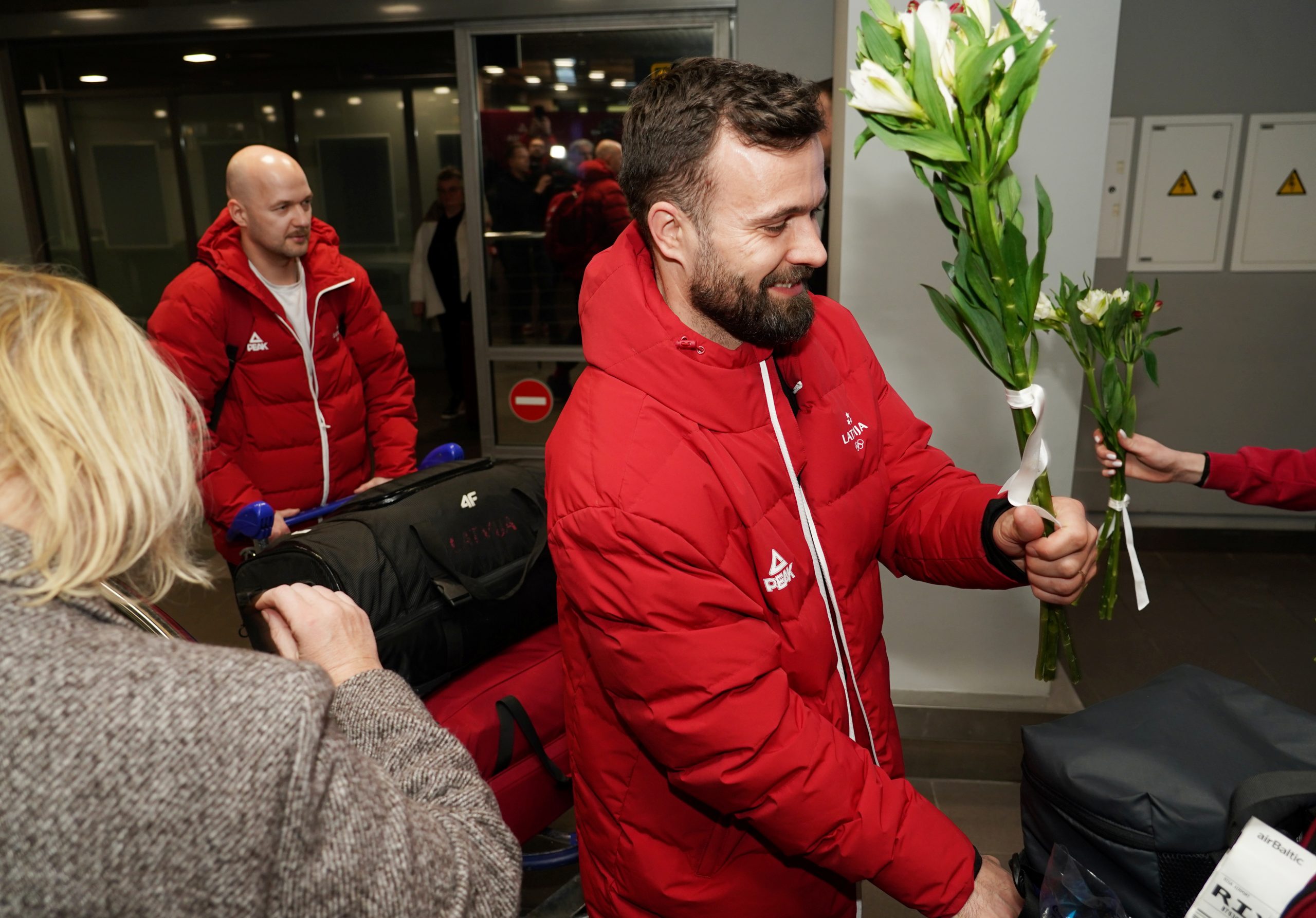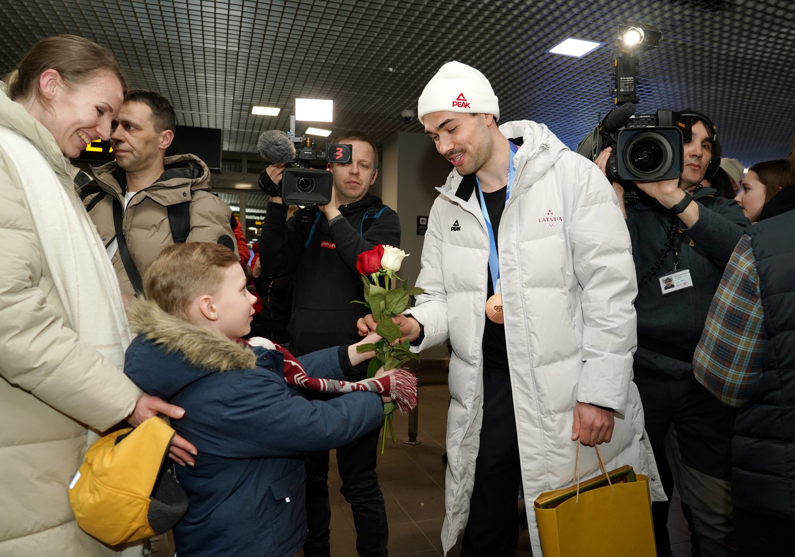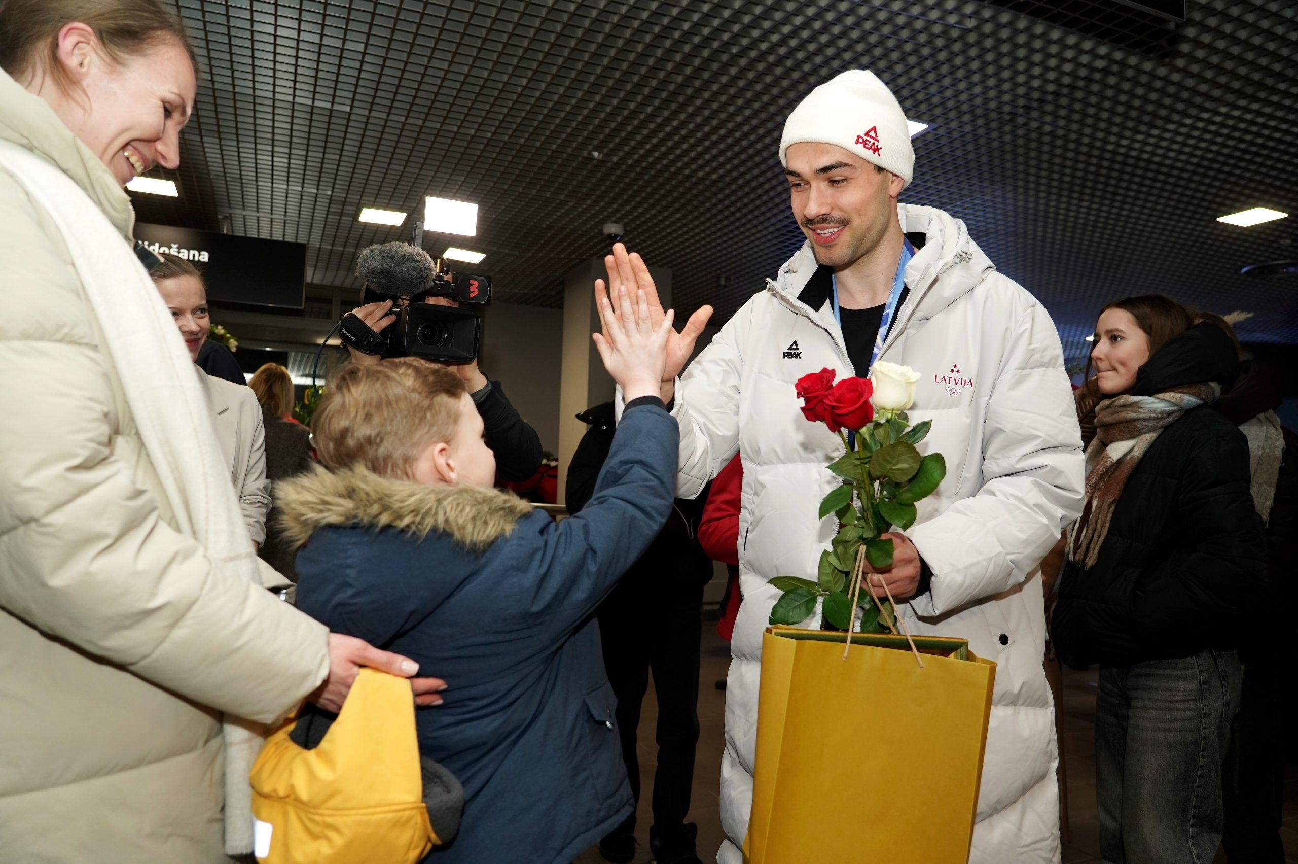 Rīgas lidostā otrdien tika sagaidīti Milānas un Kortīnas olimpisko spēļu dalībnieki, starp kuriem bija arī bronzas medaļu ieguvušais šorttrekists Roberts Krūzbergs.