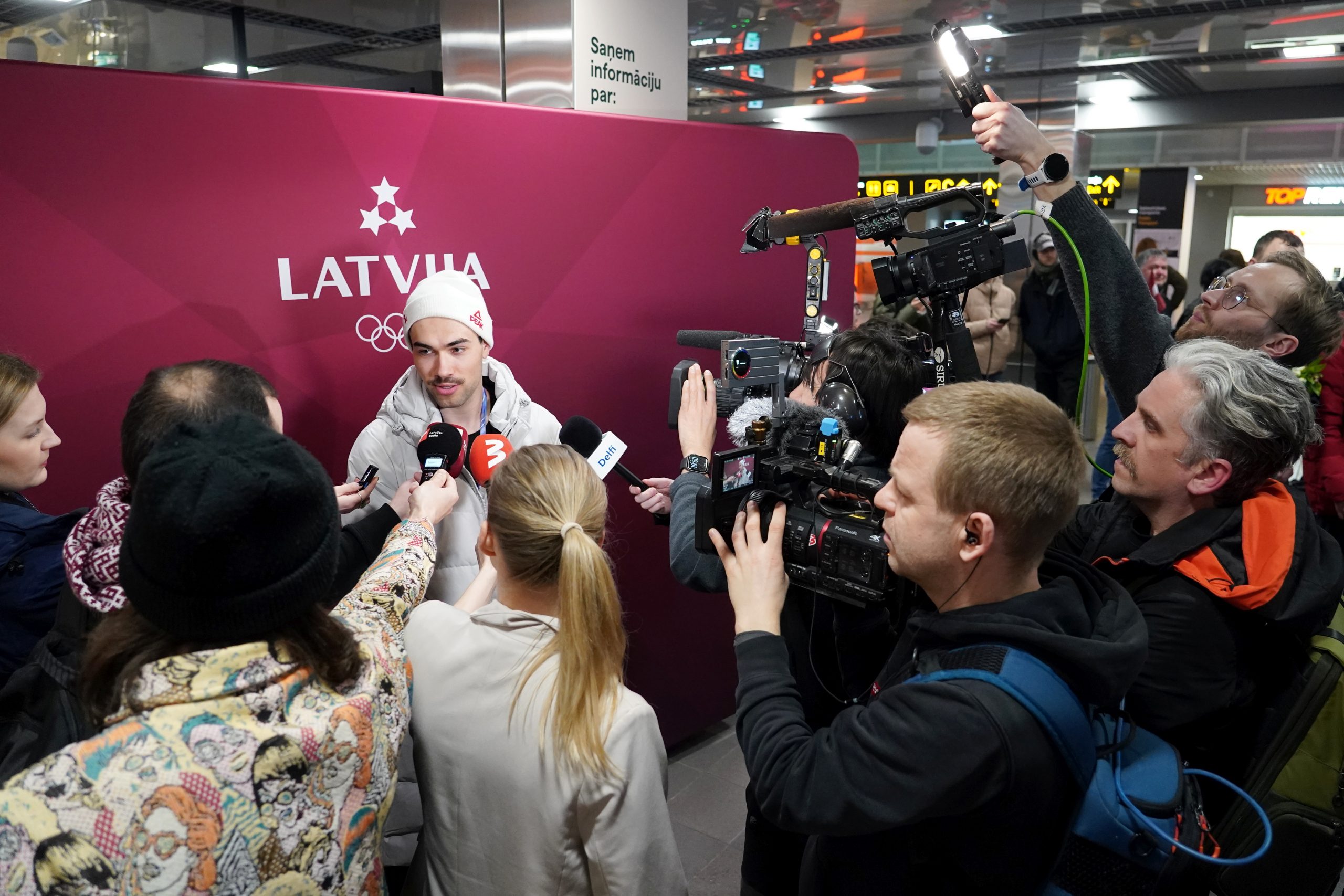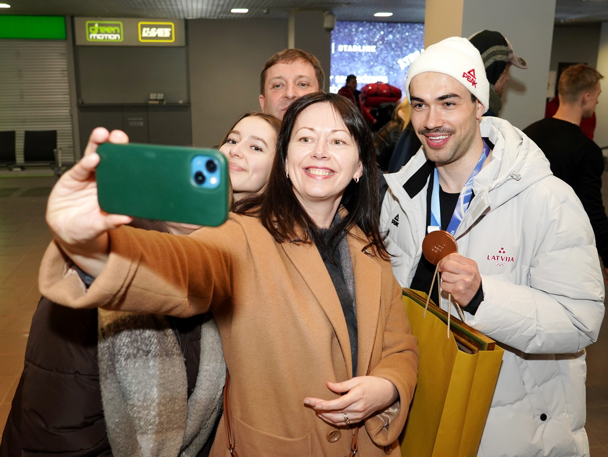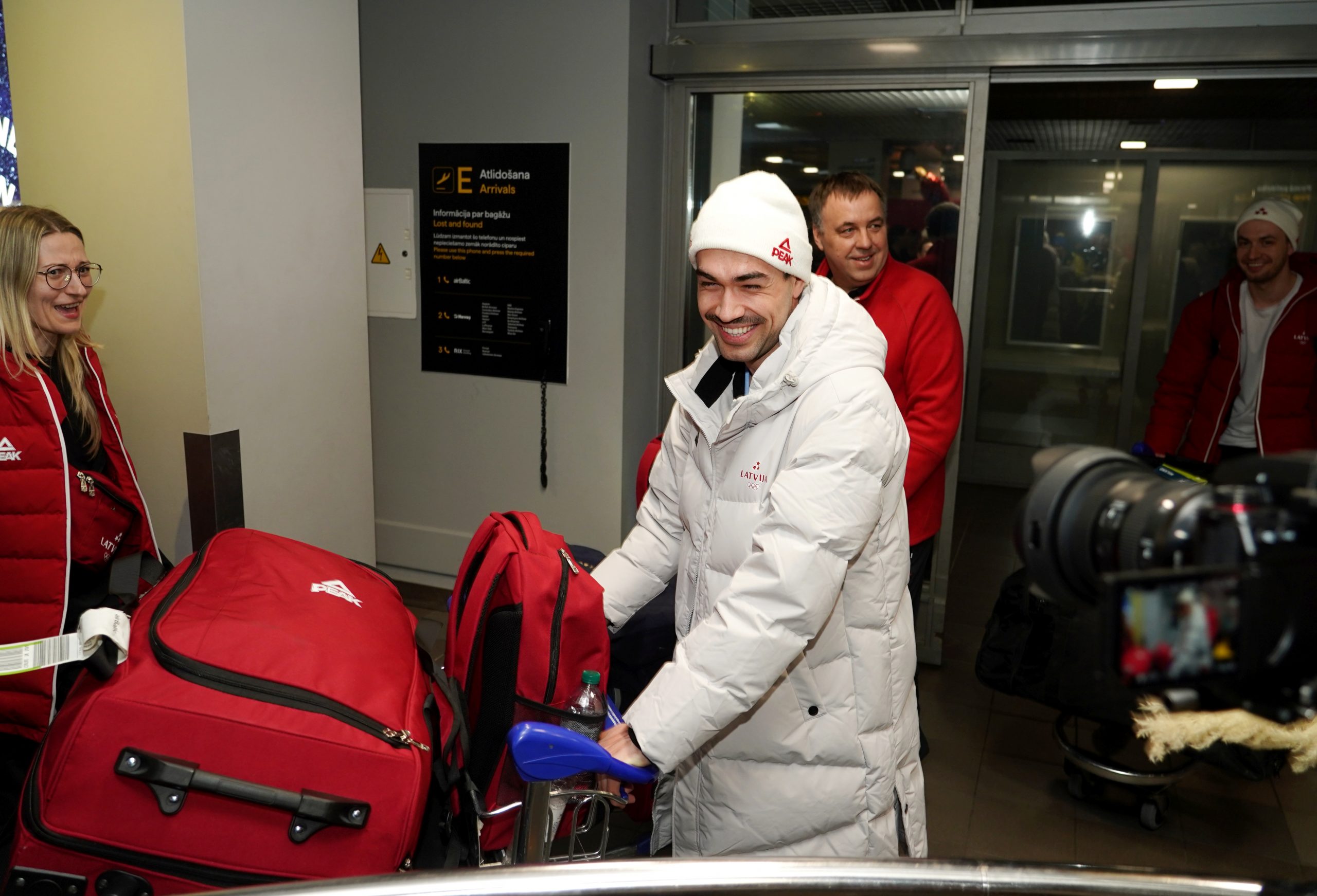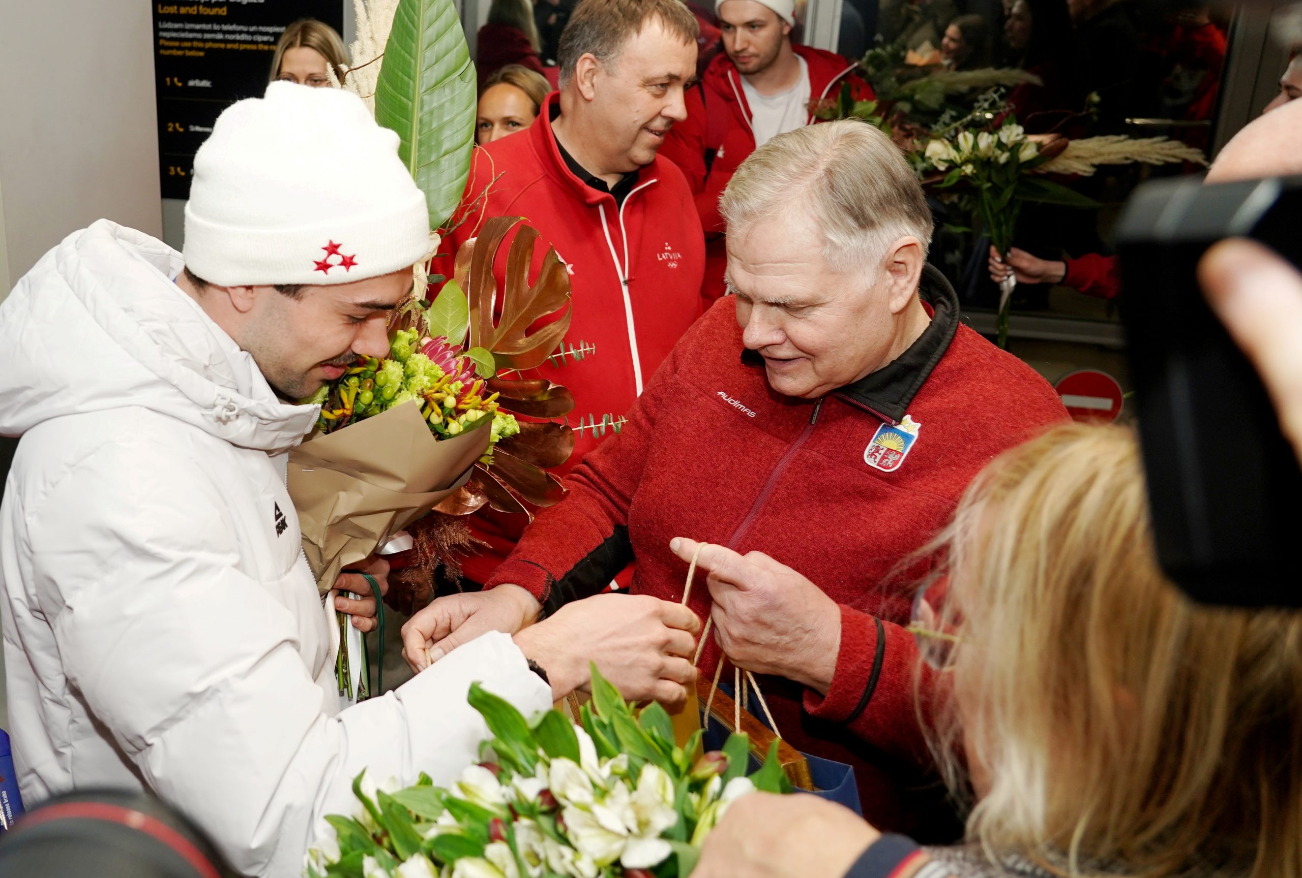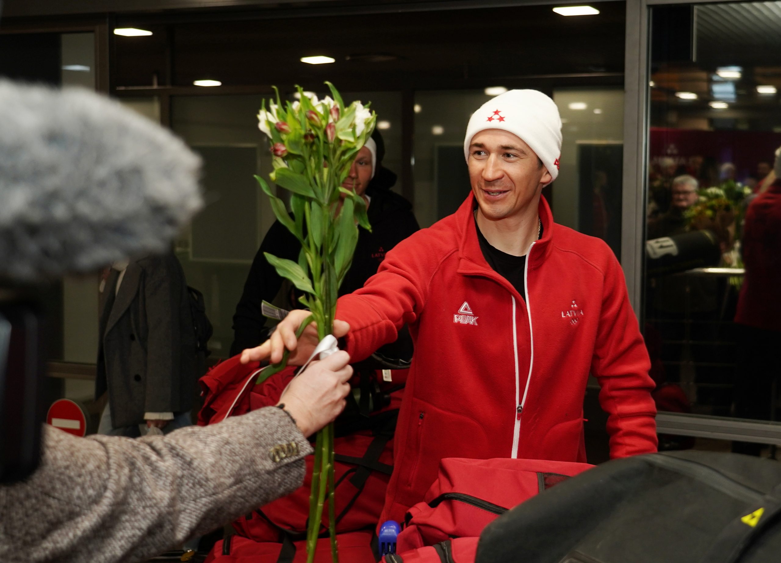Rīgas lidostā otrdien tika sagaidīti Milānas un Kortīnas olimpisko spēļu dalībnieki, starp kuriem bija arī bronzas medaļu ieguvušais šorttrekists Roberts Krūzbergs.